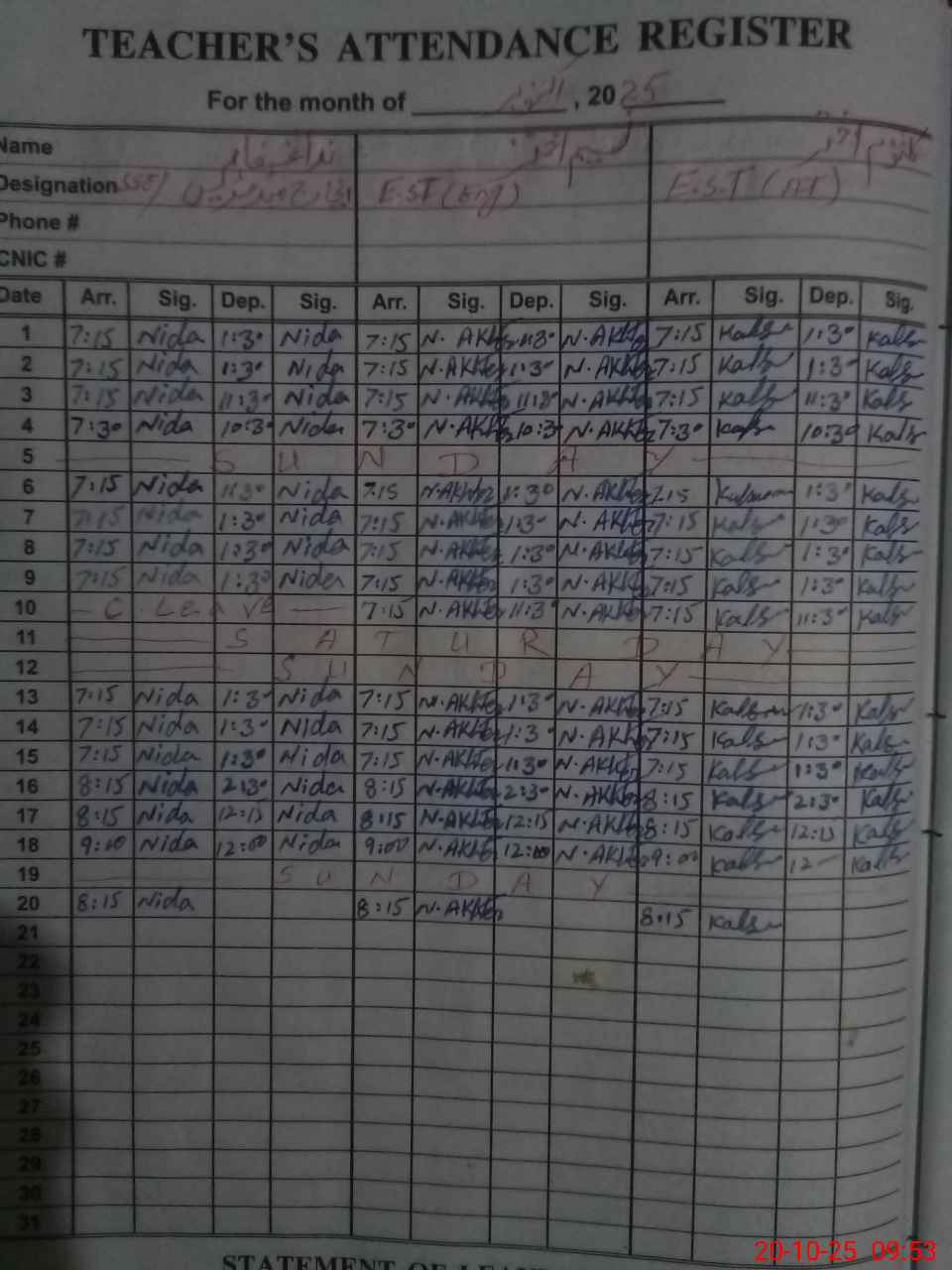 | CNIC | Full Name | Designation | R/C | Absence During Last Calender Month |