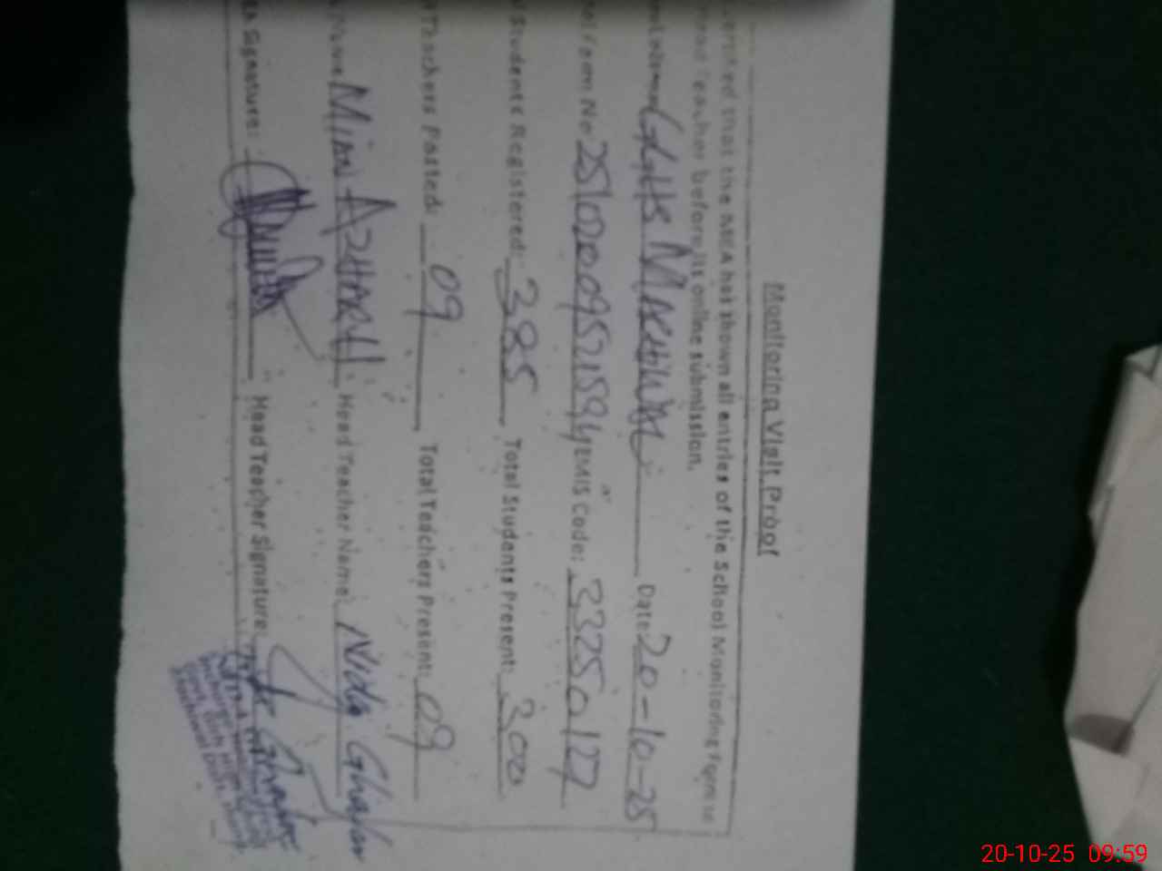 | Attendance Register | Head Teacher | MEA with School | Visit Proof |