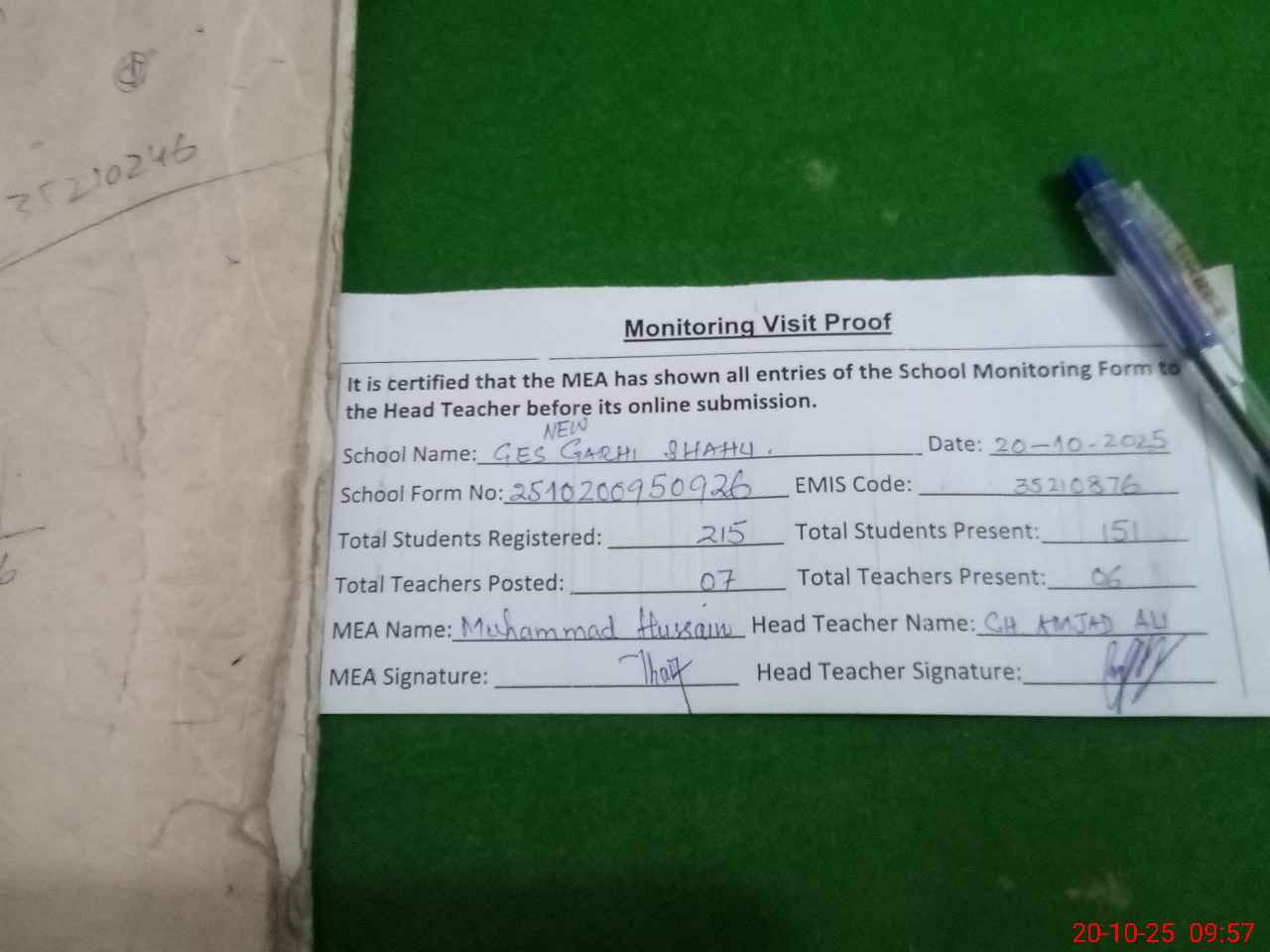 | Attendance Register | Head Teacher | MEA with School | Visit Proof |