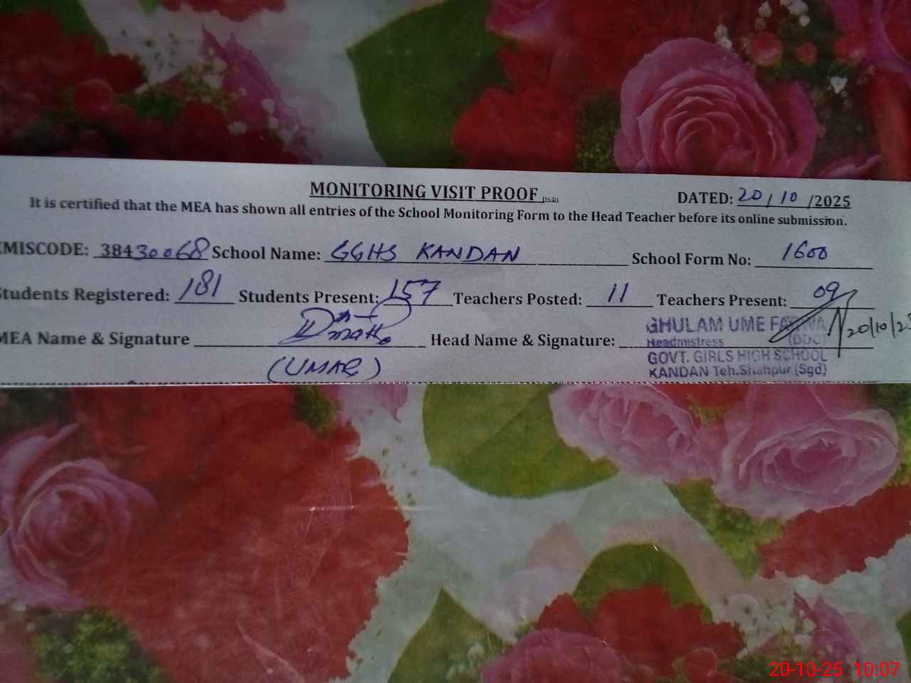 | Monitoring Date: 20-10-2025 | Start Time: 20-10-2025 09:22 AM | End Time: 20-10-2025 10:12 AM | Name of MEA: UM**** DR**** | |