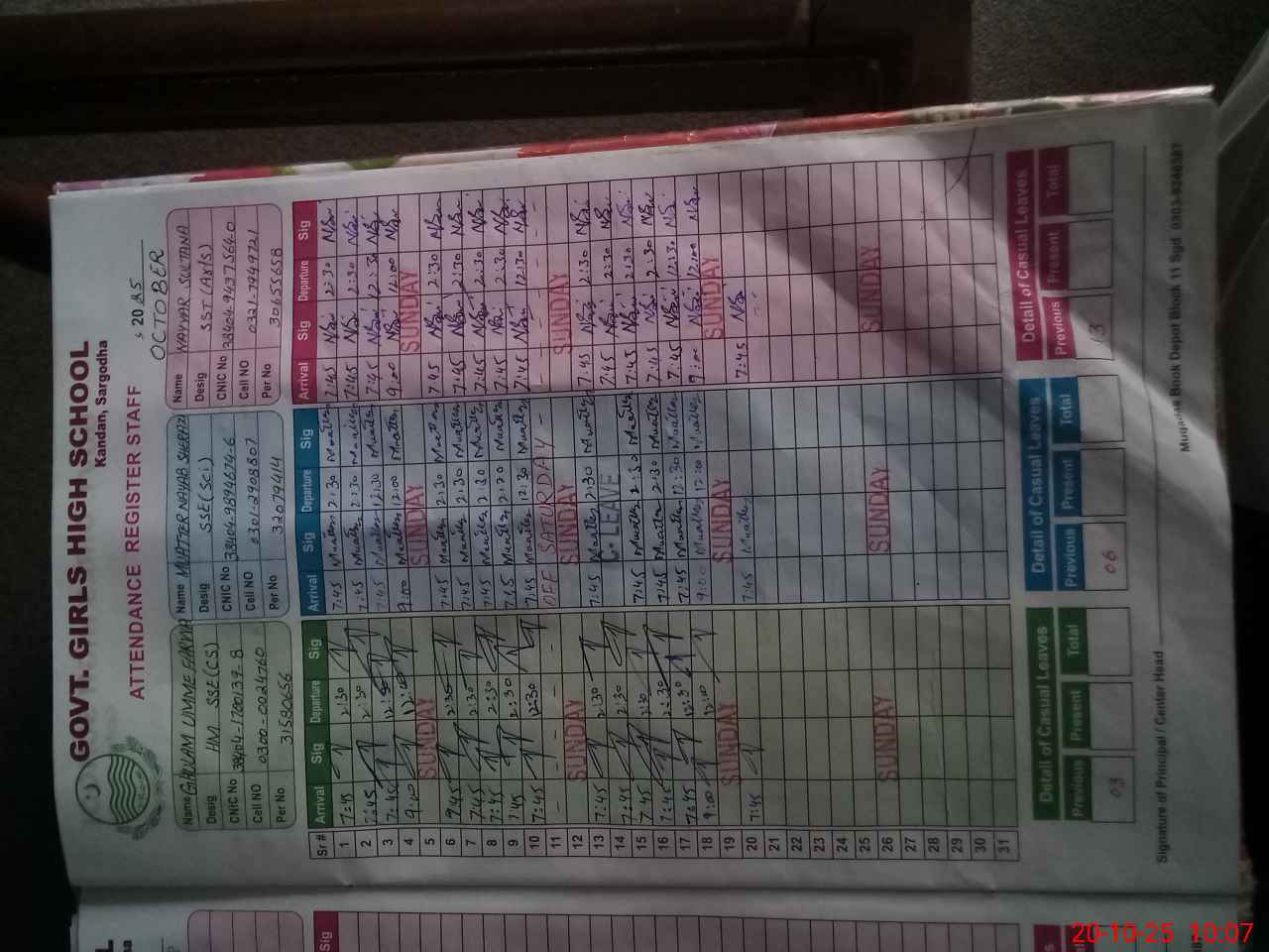 | CNIC | Full Name | Designation | R/C | Absence during last cal. month |