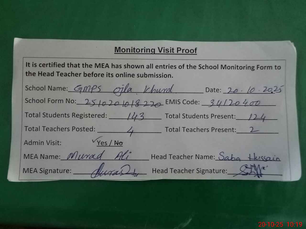 | Attendance Register | Head Teacher | MEA with School | Visit Proof |