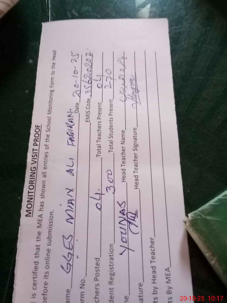 | Attendance Register | Head Teacher | MEA with School | Visit Proof |