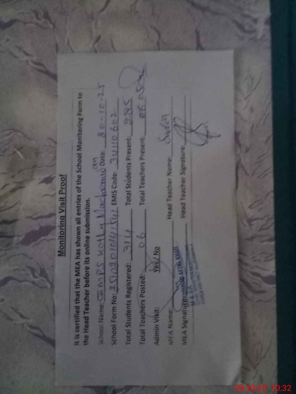 | Attendance Register | Head Teacher | MEA with School | Visit Proof |