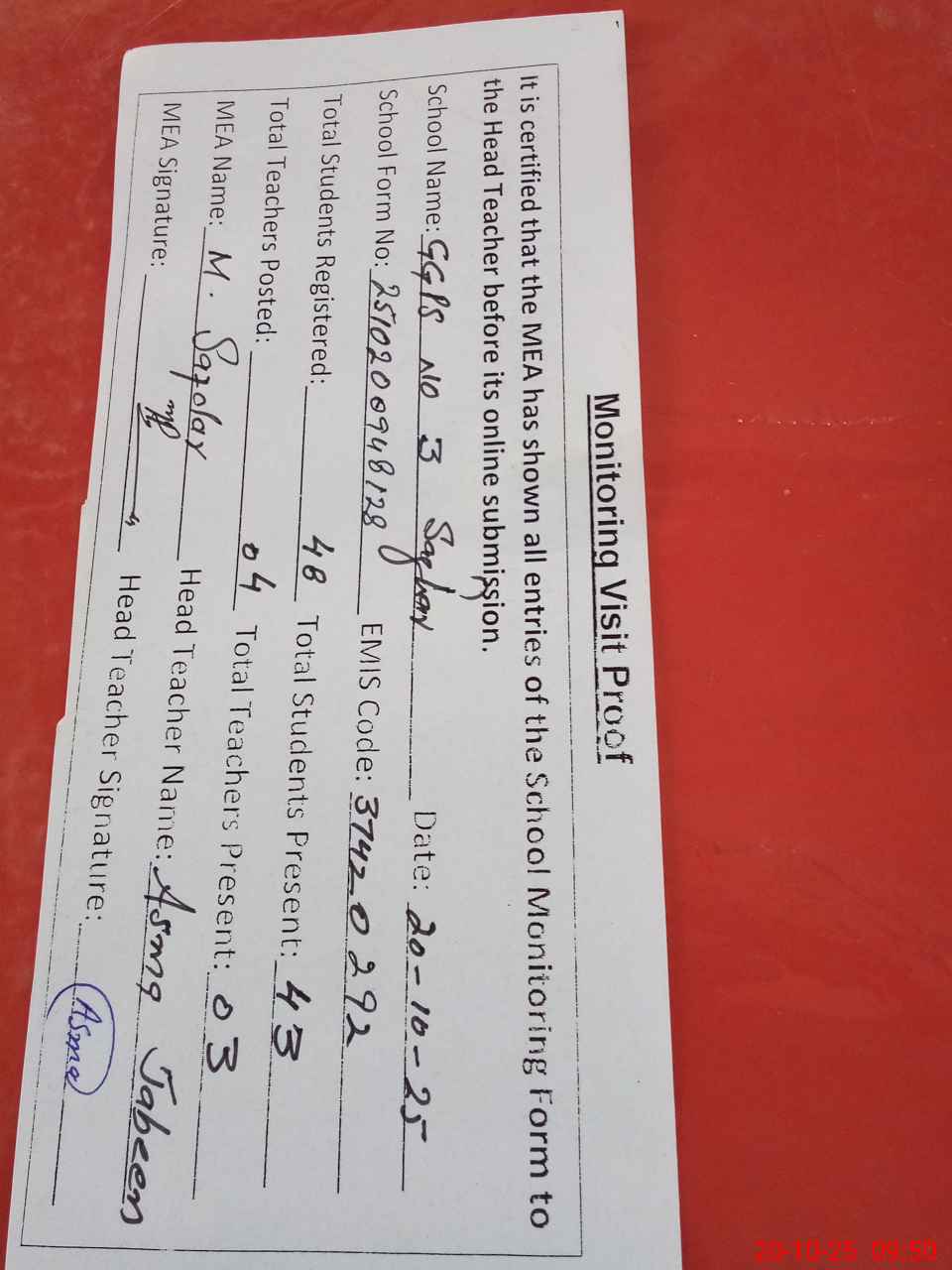 | Attendance Register | Head Teacher | MEA with School | Visit Proof |