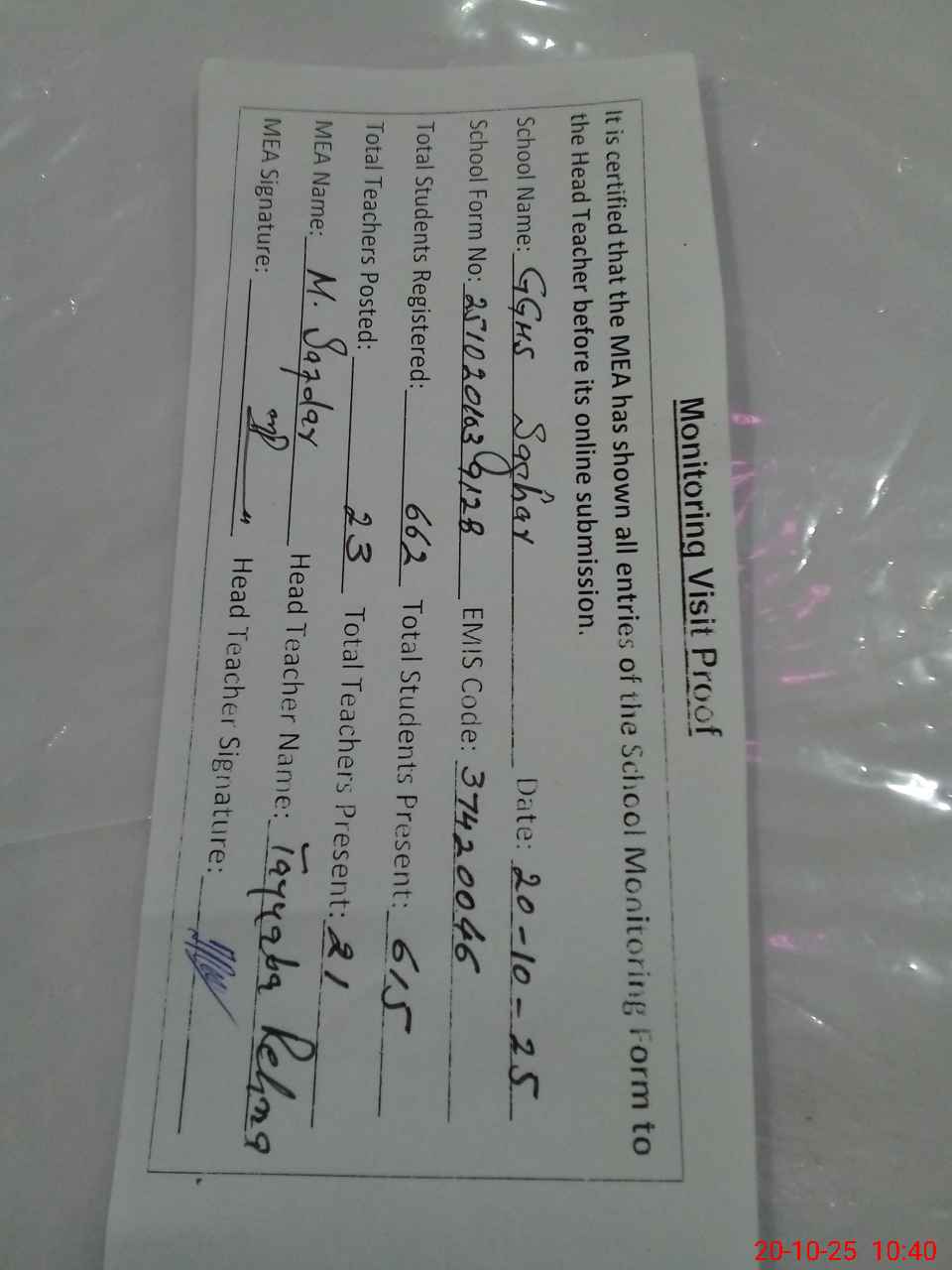 | Attendance Register | Head Teacher | MEA with School | Visit Proof |