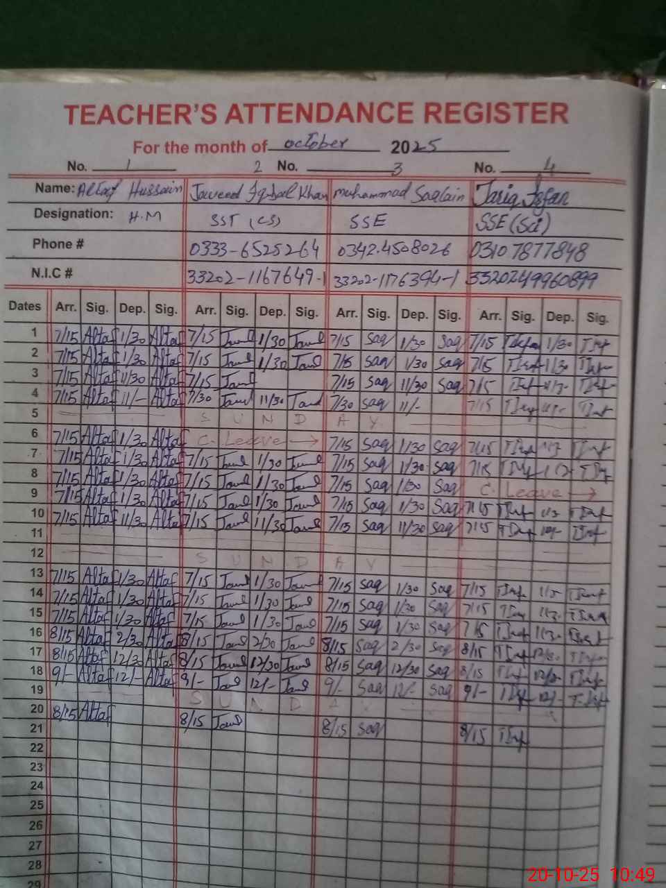 | CNIC | Full Name | Designation | R/C | Absence during last cal. month |