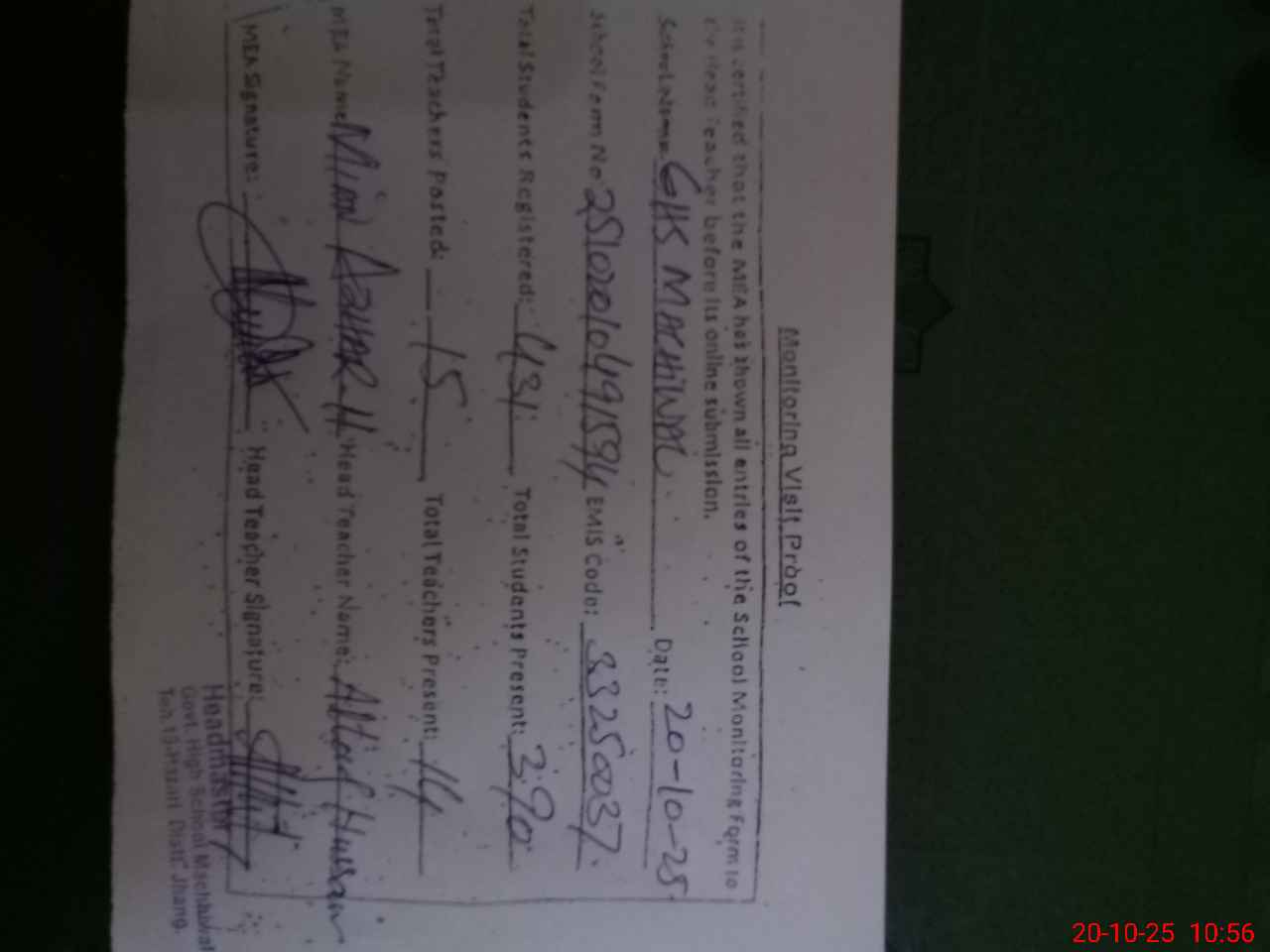 | Certified that this School was Inspected by the Undersigned MEA/DMO Today and the Information Stated Above is as Per Record. | |||||