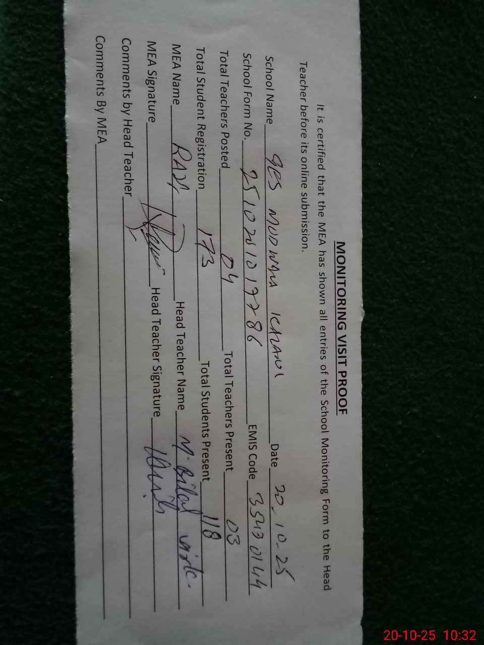 | Attendance Register | Head Teacher | MEA with School | Visit Proof |