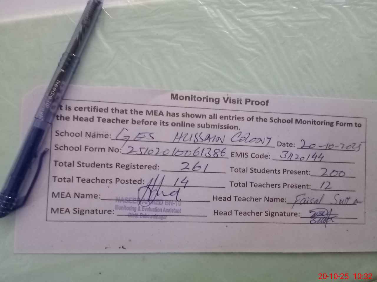 | Attendance Register | Head Teacher | MEA with School | Visit Proof |