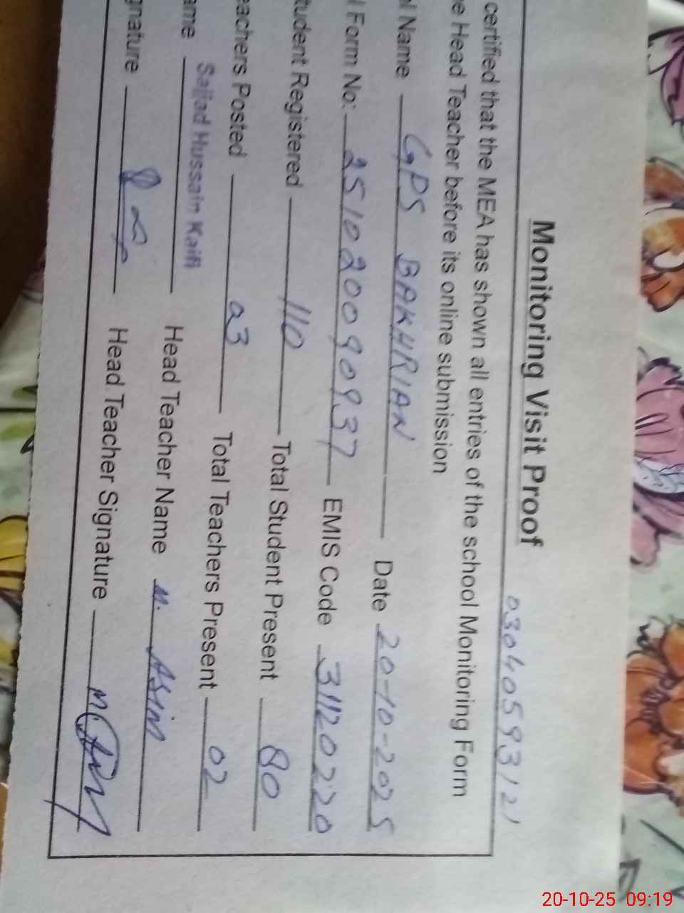 | Attendance Register | Head Teacher | MEA with School | Visit Proof |