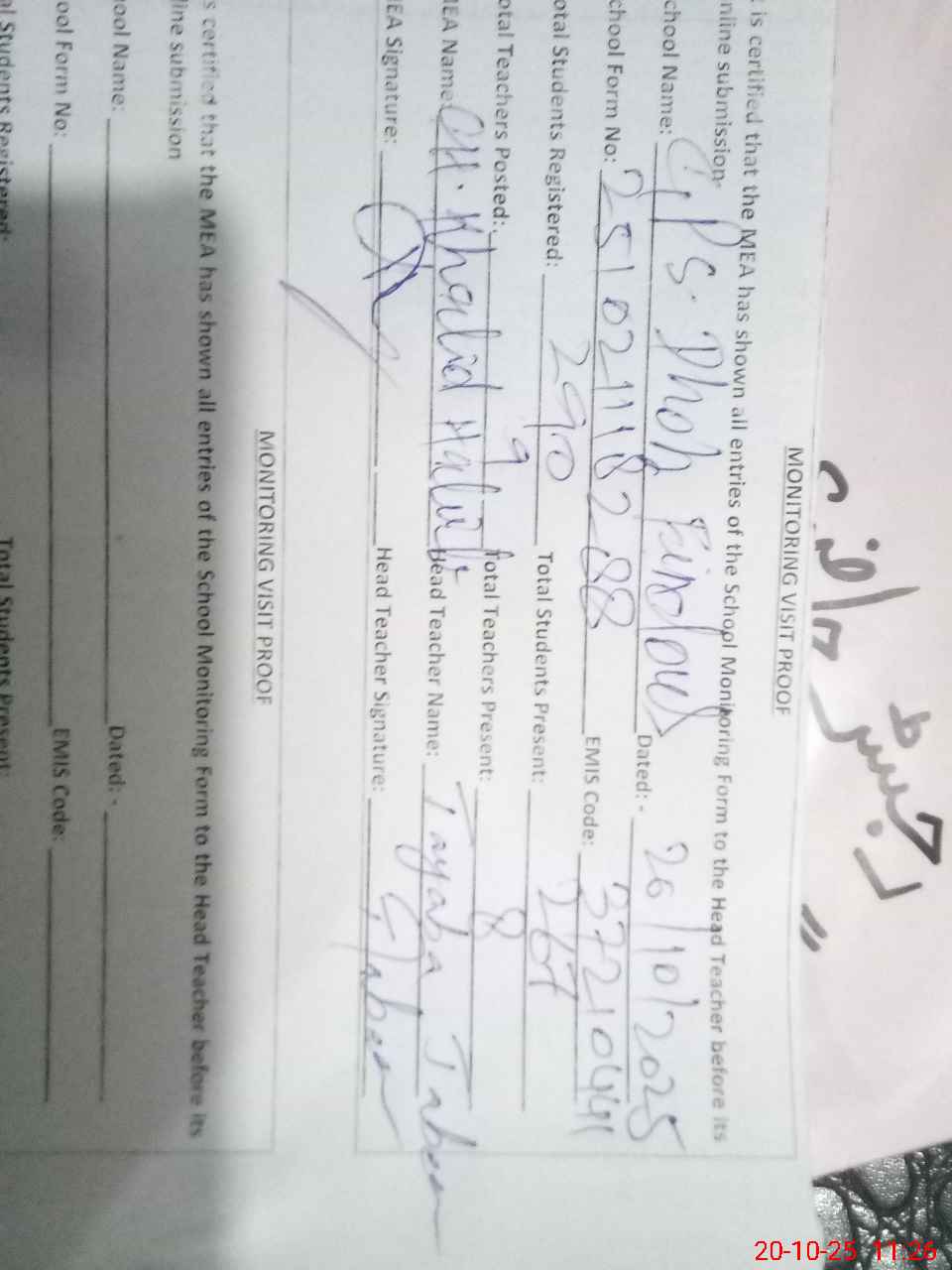 | Attendance Register | Head Teacher | MEA with School | Visit Proof |