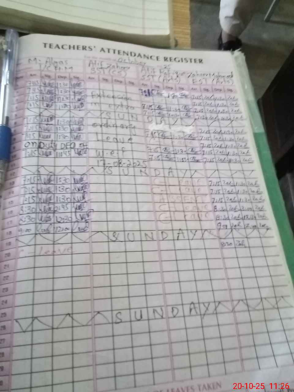 | 37**** | At**** Za**** Ch**** | SST | Regular | 0 | 0 | 0 | 0 | 0 | 0 | 0 | 0 | 0 | Absent (Un-Authorized) |