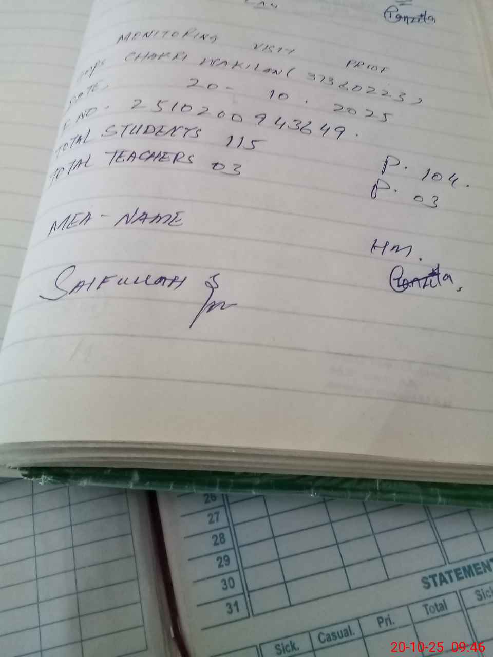 | Attendance Register | Head Teacher | MEA with School | Visit Proof |