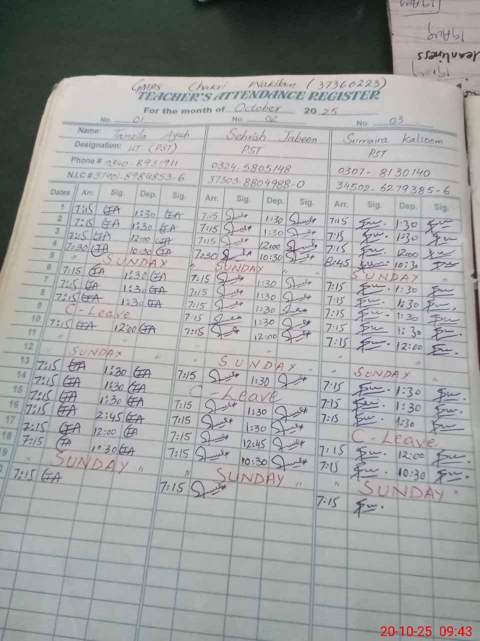 | CNIC | Full Name | Designation | R/C | Absence during last cal. month |
