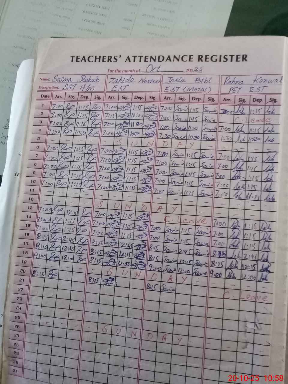 | CNIC | Full Name | Designation | R/C | Absence During Last Calender Month |
