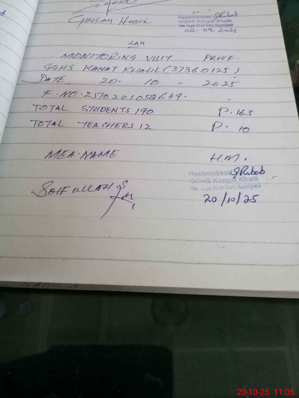 | Attendance Register | Head Teacher | MEA with School | Visit Proof |