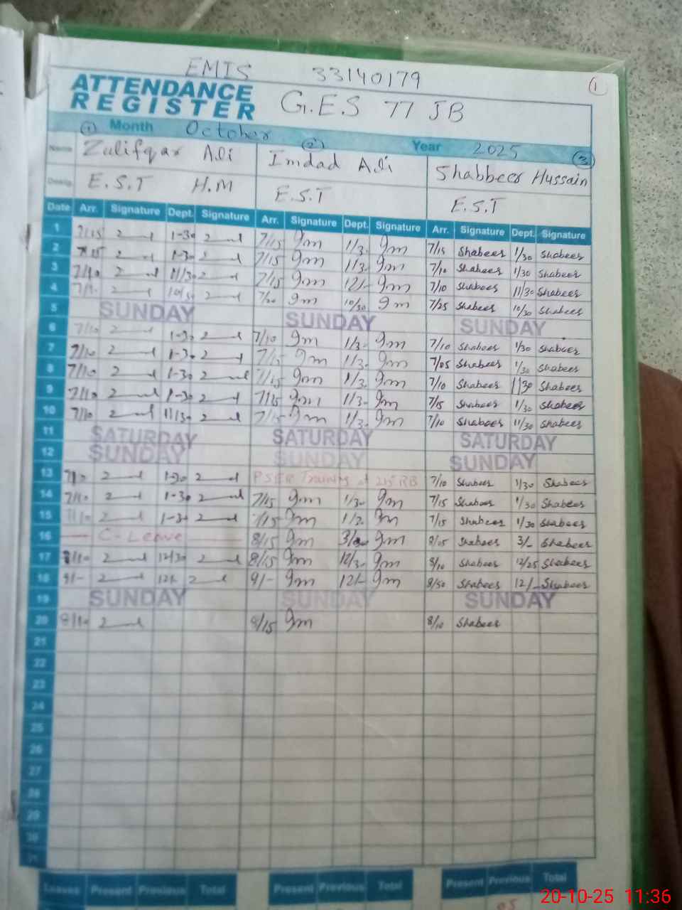 | CNIC | Full Name | Designation | R/C | Absence during last cal. month |