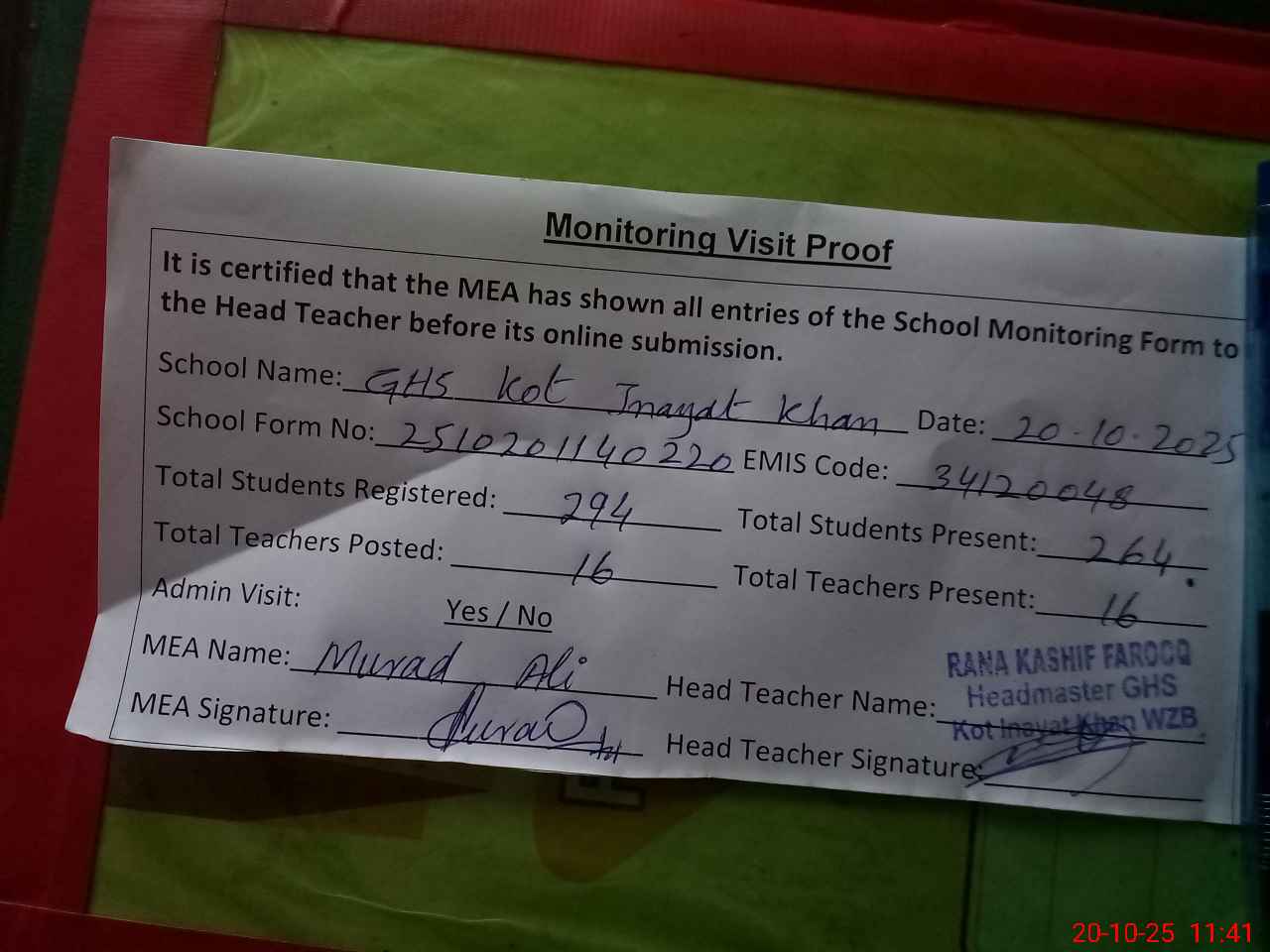 | EMIS Code: 34120048 | Name of School: GHS KOT INAYAT KHAN | |||