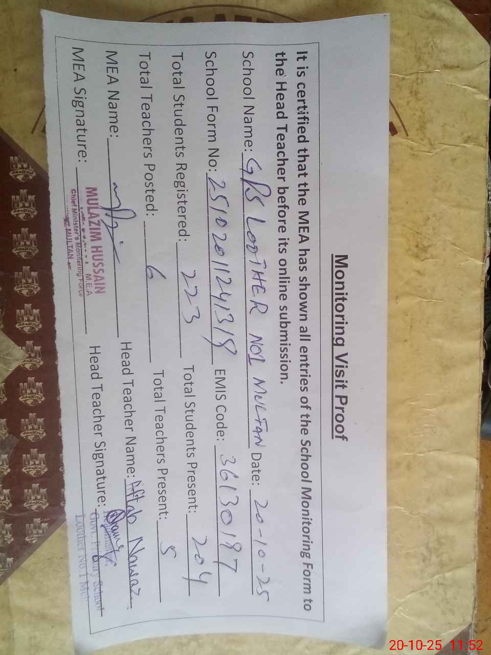 | EMIS Code: 36130197 | Name of School: GPS LOOTHER NO. 1 | |||