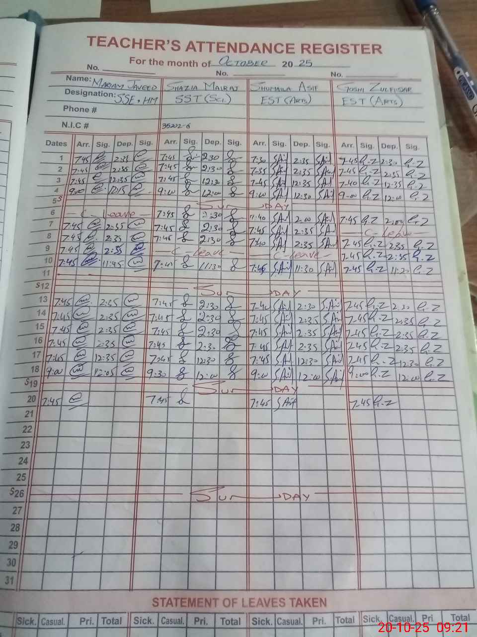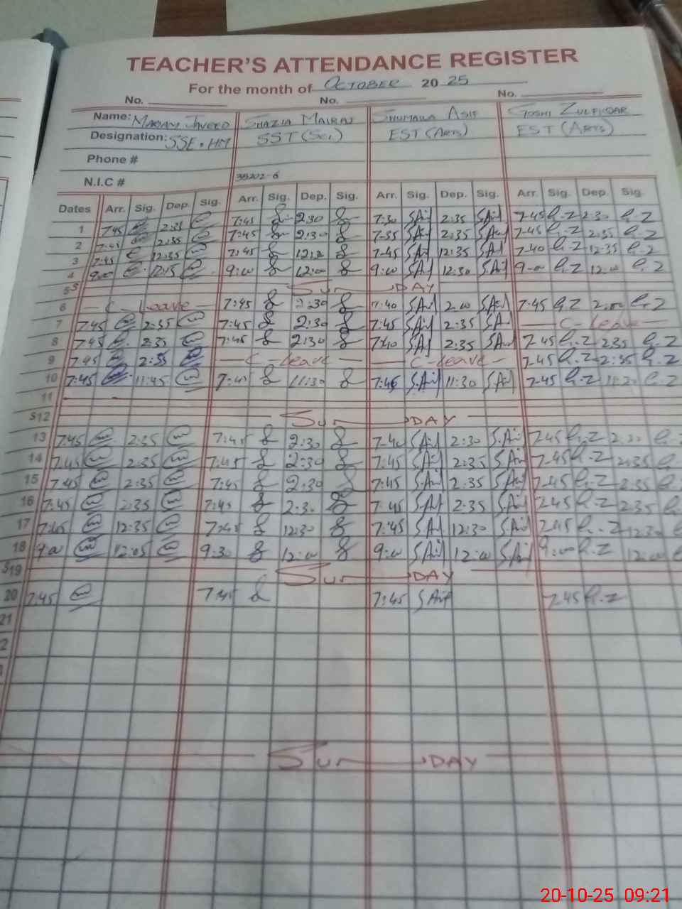 | 35**** | Sa**** Na**** | EST | Regular | 0 | 0 | 0 | 0 | 0 | 0 | 0 | 0 | 0 | Exam Duty |