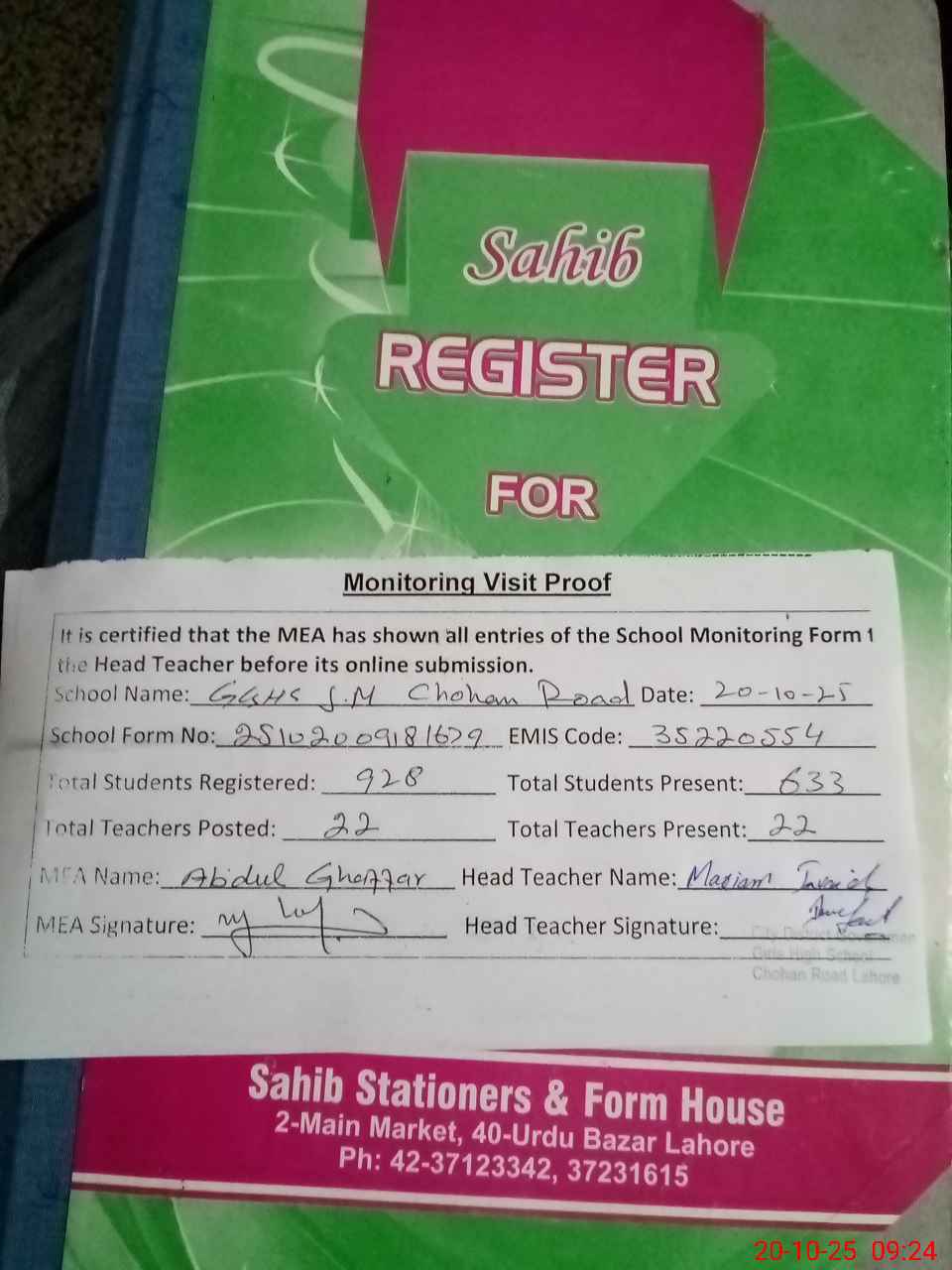 | EMIS Code: 35220554 | Name of School: GGHS JUNIOR MODEL CHOHAN ROAD EX-MCL (Newly Upgraded) | |||