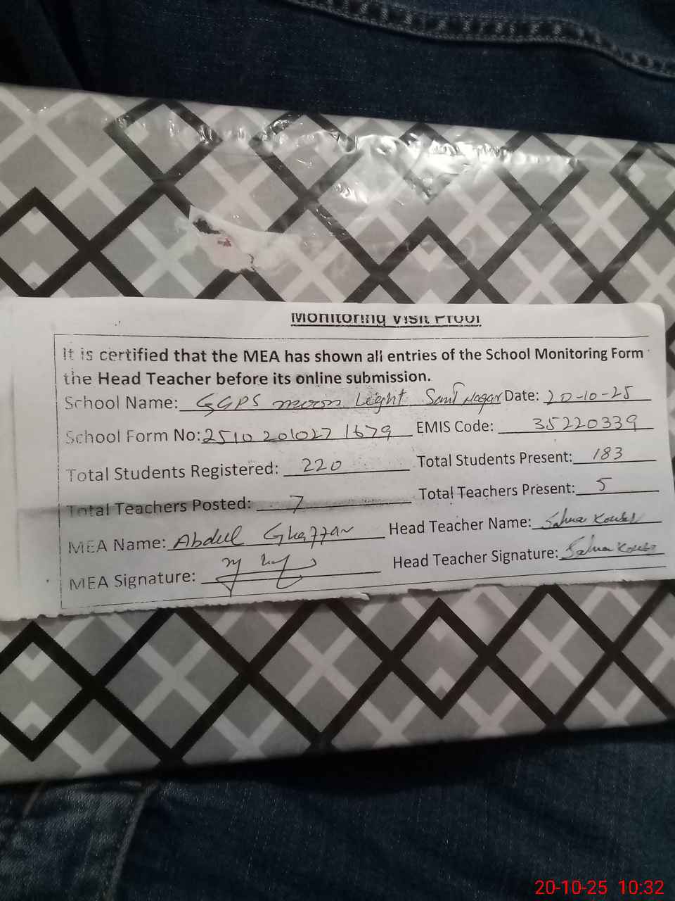 | EMIS Code: 35220339 | Name of School: GGPS MOON LIGHT SANT NAGAR | |||