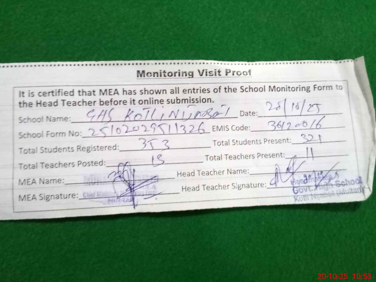 | Monitoring Date: 20-10-2025 | Start Time: 20-10-2025 09:51 AM | End Time: 20-10-2025 10:53 AM | Name of MEA: MU**** YA**** | |