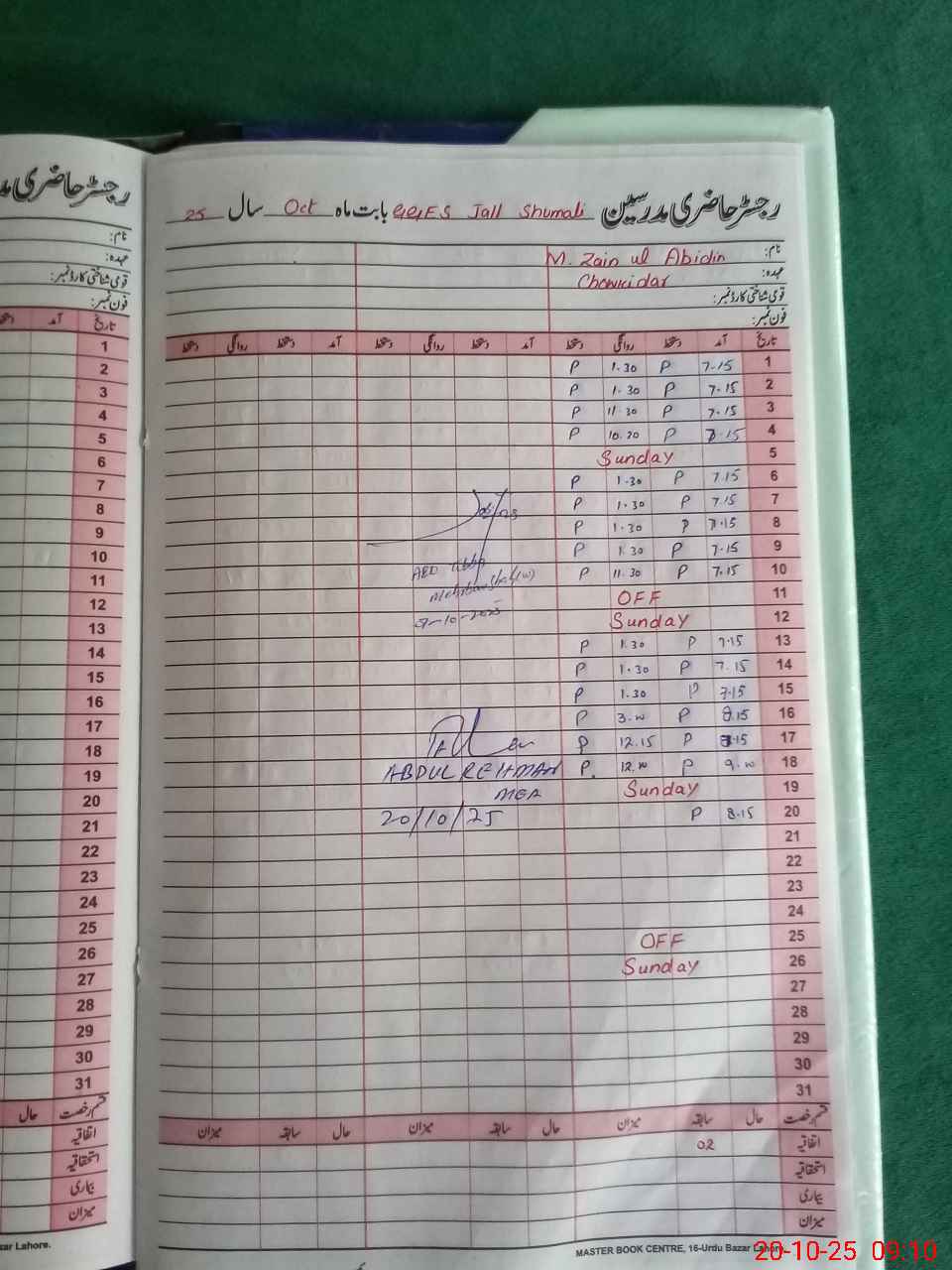 | CNIC | Full Name | Designation | R/C | Absence During Last Calender Month |