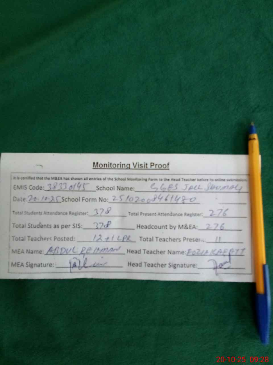 | Attendance Register | Head Teacher | MEA with School | Visit Proof |