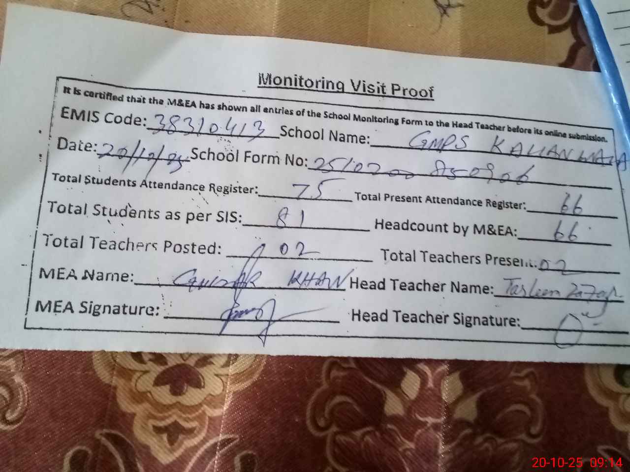 | Attendance Register | Head Teacher | MEA with School | Visit Proof |