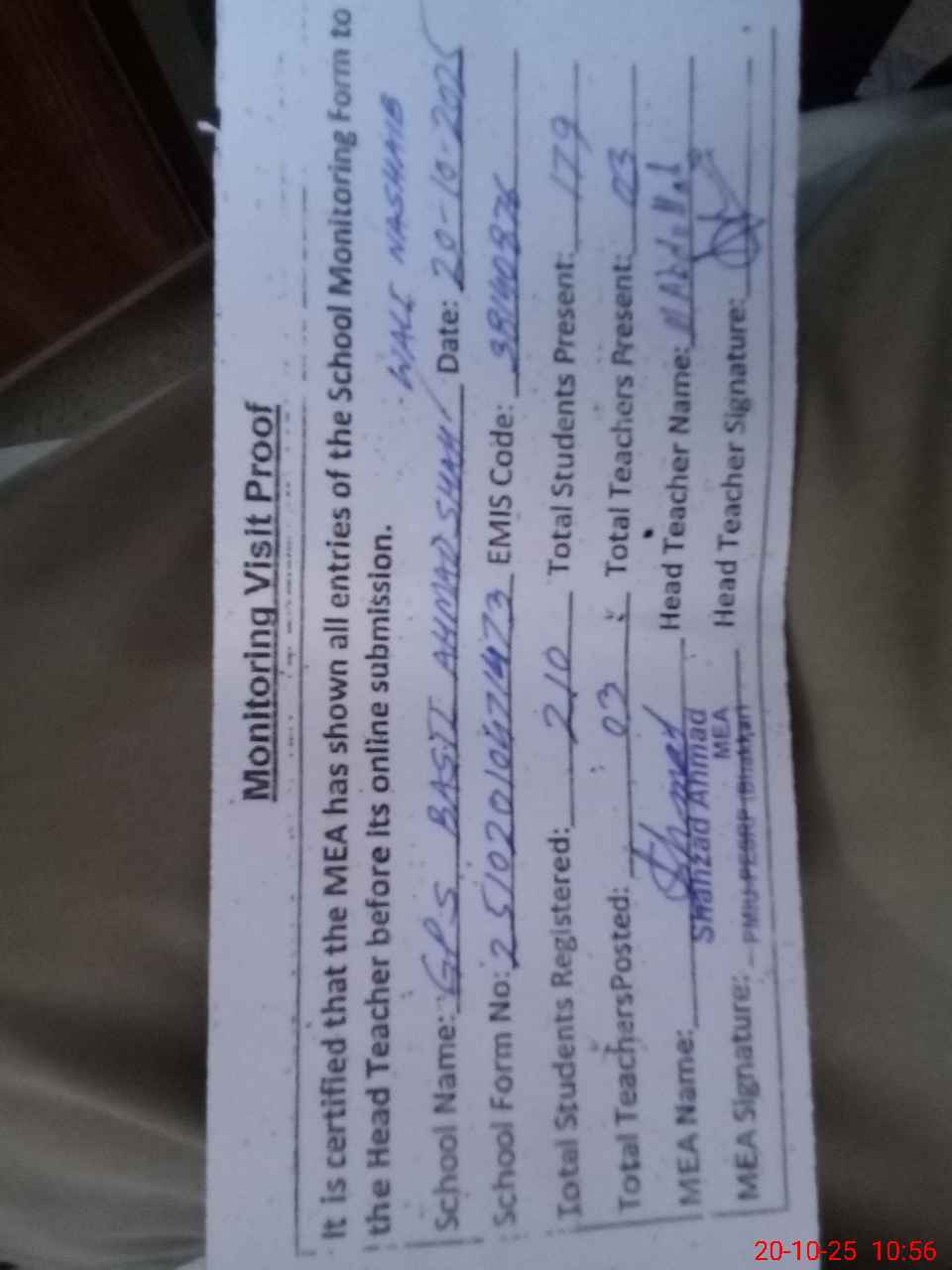 | Monitoring Date: 20-10-2025 | Start Time: 20-10-2025 10:30 AM | End Time: 20-10-2025 10:56 AM | Name of MEA: SH**** AH**** | |