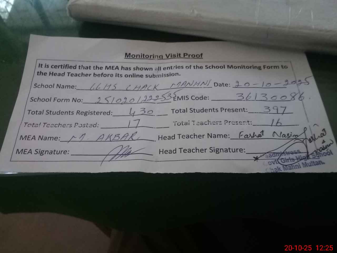 | Attendance Register | Head Teacher | MEA with School | Visit Proof |