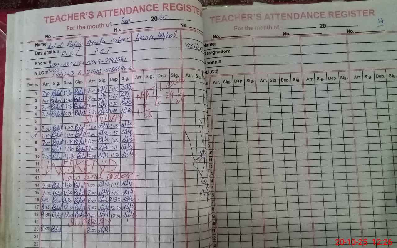 | CNIC | Full Name | Designation | R/C | Absence During Last Calender Month |