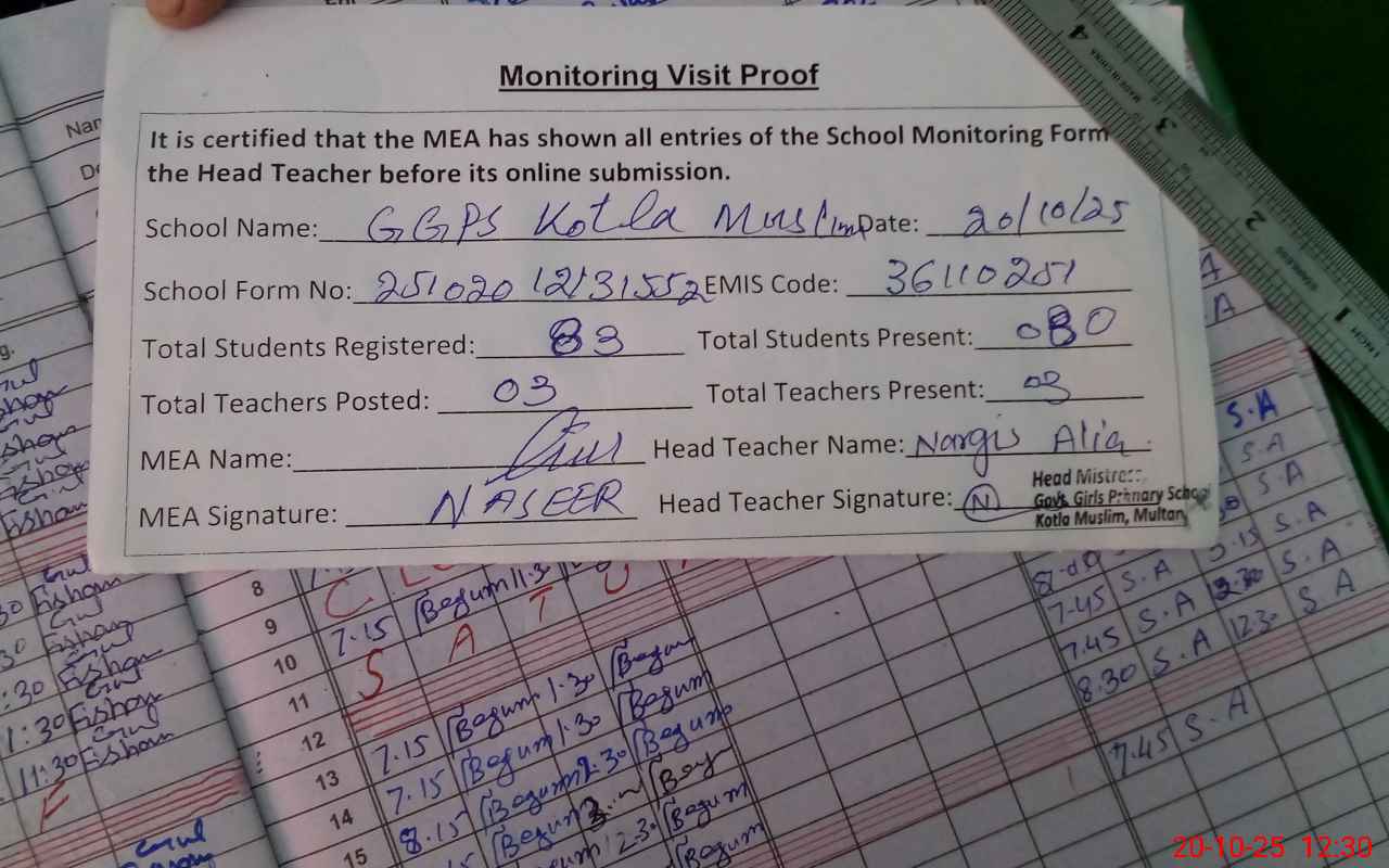 | Attendance Register | Head Teacher | MEA with School | Visit Proof |