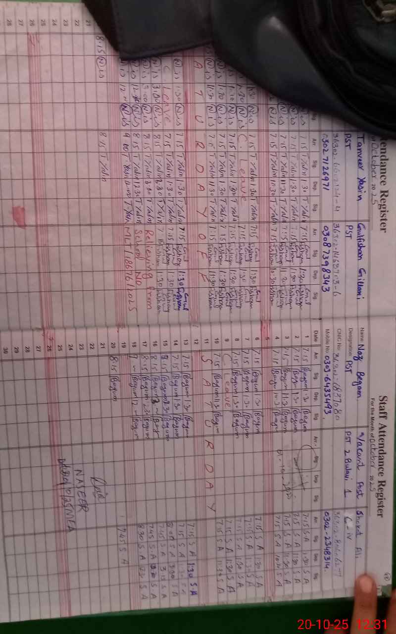 | CNIC | Full Name | Designation | R/C | Absence During Last Calender Month |