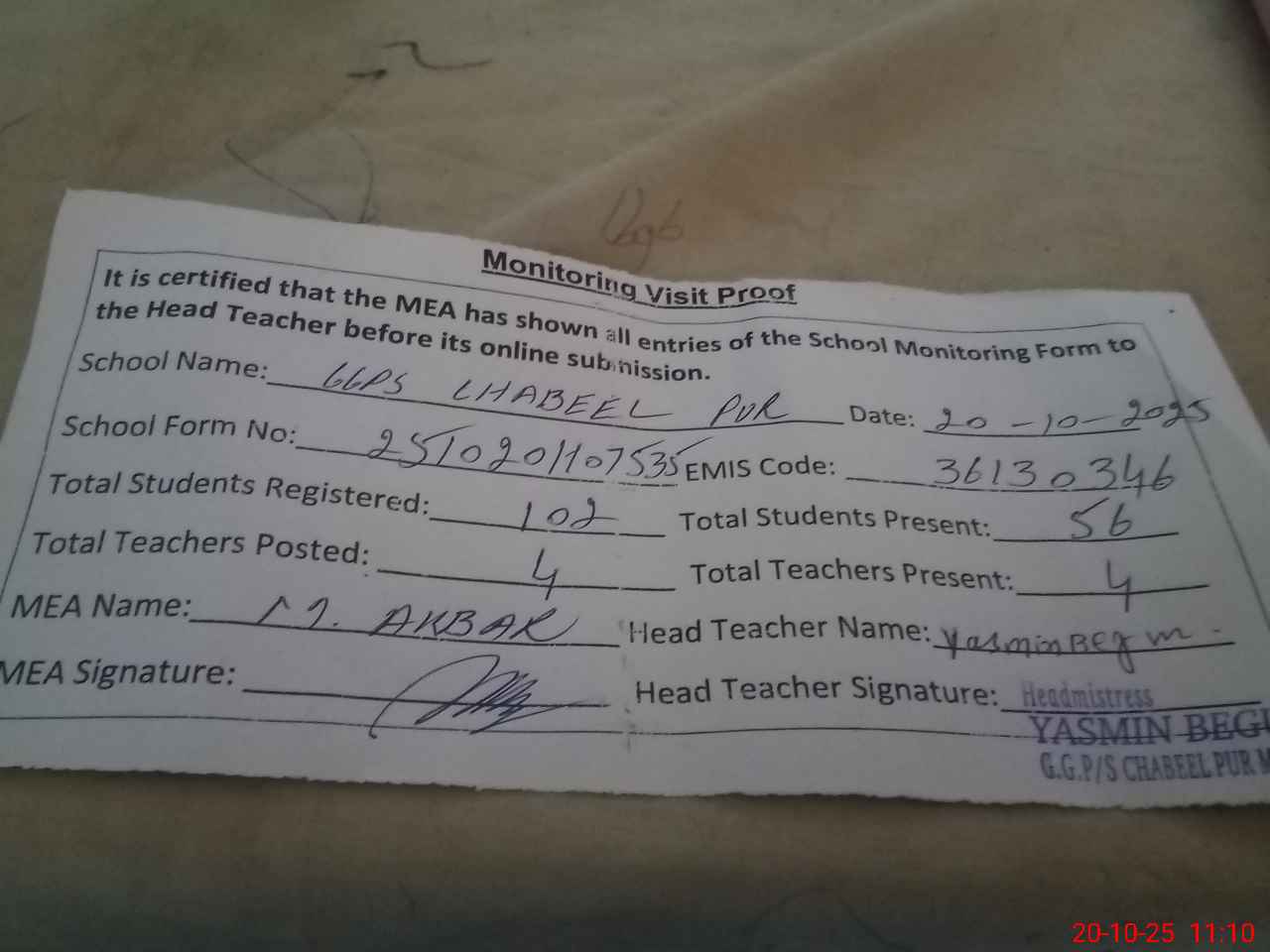 | Attendance Register | Head Teacher | MEA with School | Visit Proof |