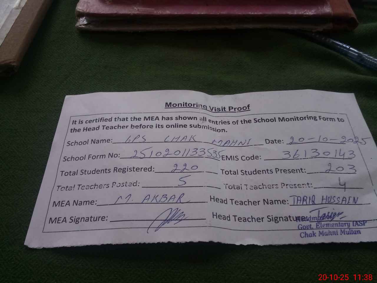 | Attendance Register | Head Teacher | MEA with School | Visit Proof |