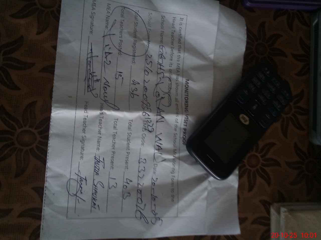 | Name: Fu**** Sh**** Designation: (School Headmaster's/Headmistress's) I/C H M Phone/Cell Number: 03**** |
