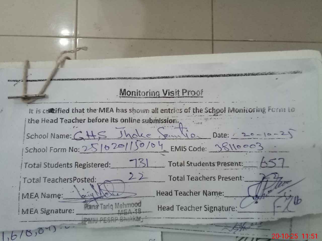 | Attendance Register | Head Teacher | MEA with School | Visit Proof |