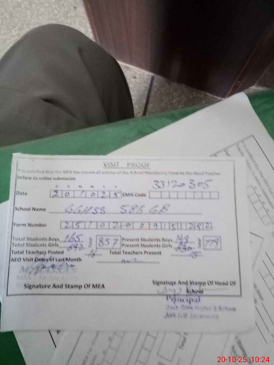 | Attendance Register | Head Teacher | MEA with School | Visit Proof |