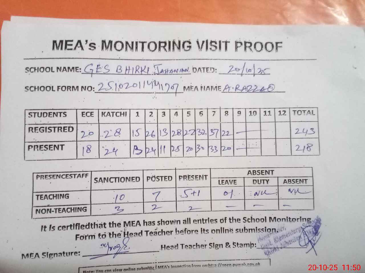| Attendance Register | Head Teacher | MEA with School | Visit Proof |
