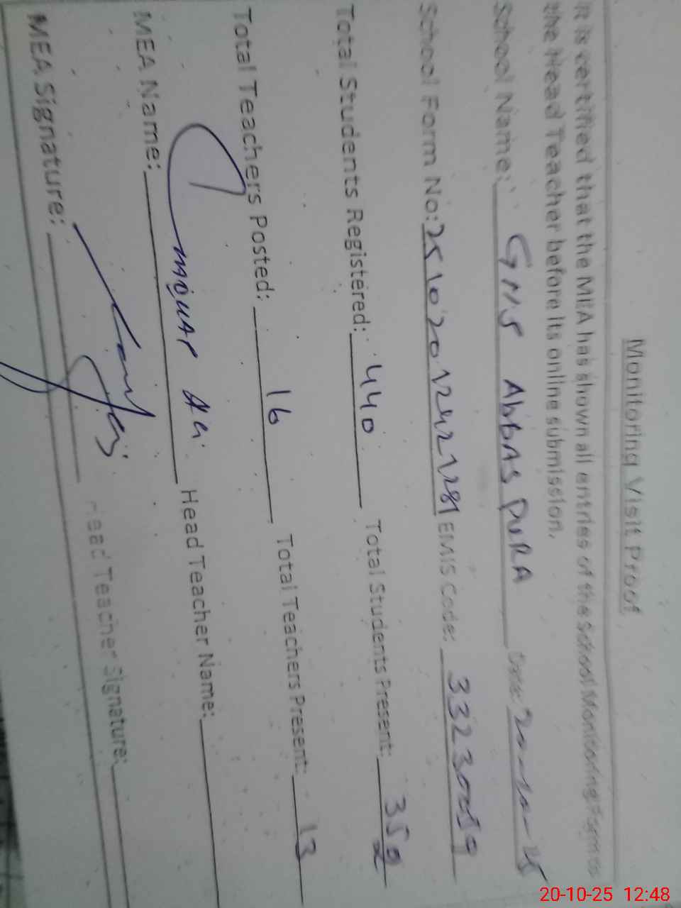 | Certified that this School was Inspected by the Undersigned MEA/DMO Today and the Information Stated Above is as Per Record. | |||||