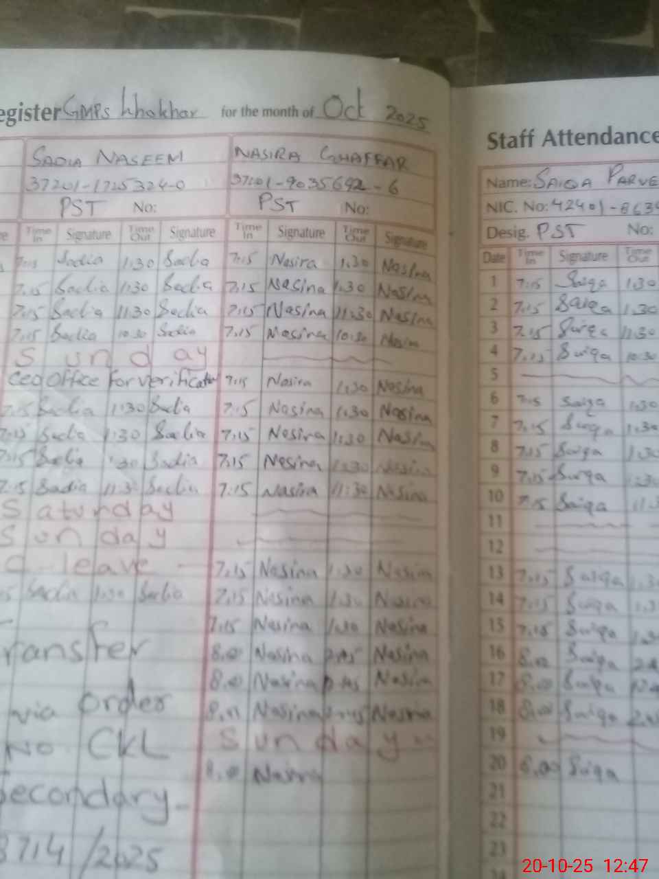 | CNIC | Full Name | Designation | R/C | Absence During Last Calender Month |