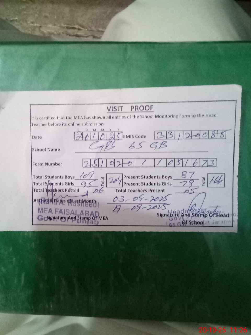 | Attendance Register | Head Teacher | MEA with School | Visit Proof |