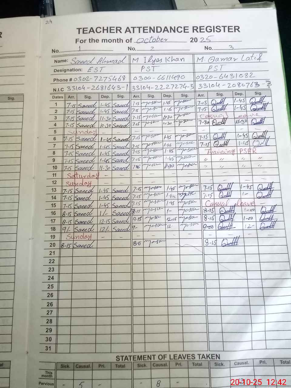 | 33**** | Sh**** Ka**** | PST | Regular | 7 | 0 | 0 | 0 | 0 | 0 | 0 | 0 | 7 | Casual |