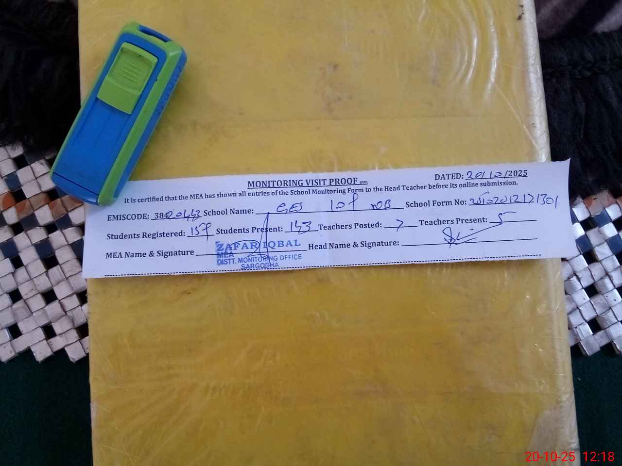 | Attendance Register | Head Teacher | MEA with School | Visit Proof |