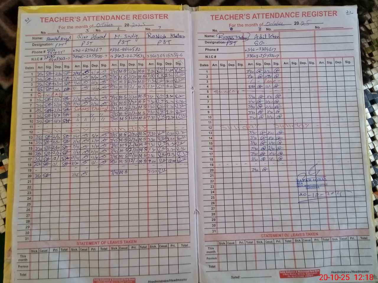 | CNIC | Full Name | Designation | R/C | Absence during last cal. month |