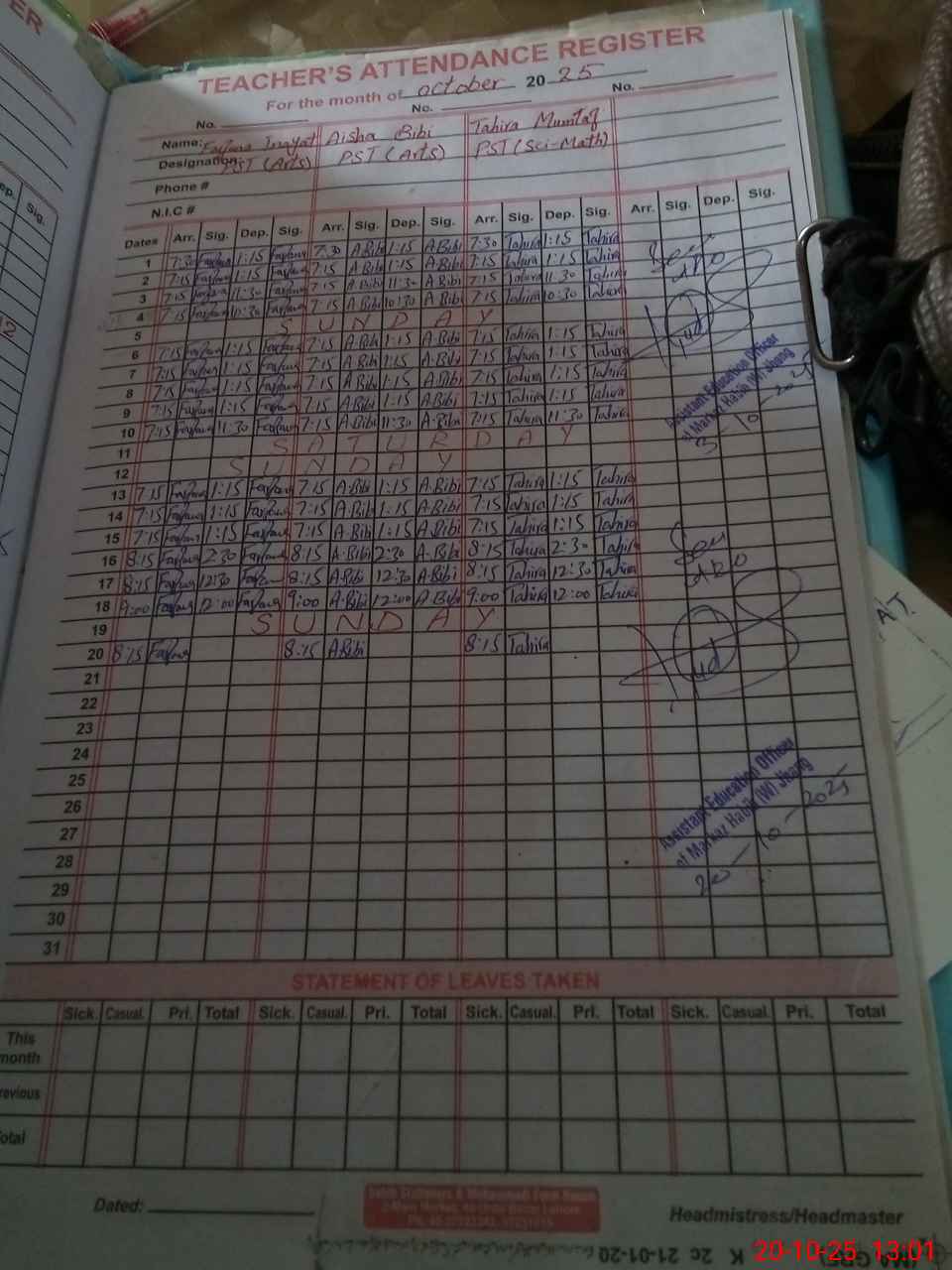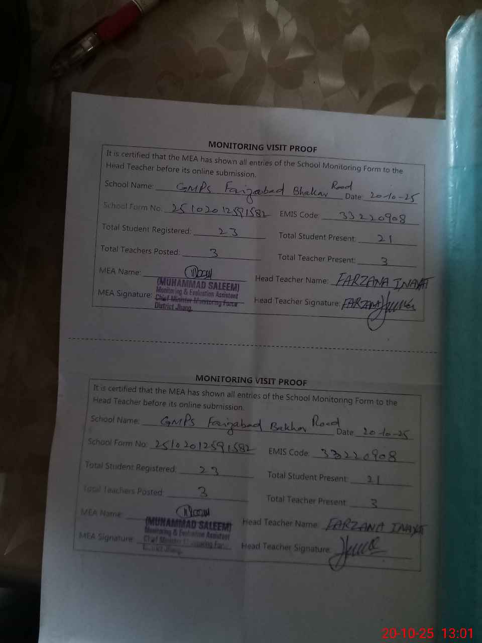 | Attendance Register | Head Teacher | MEA with School | Visit Proof |