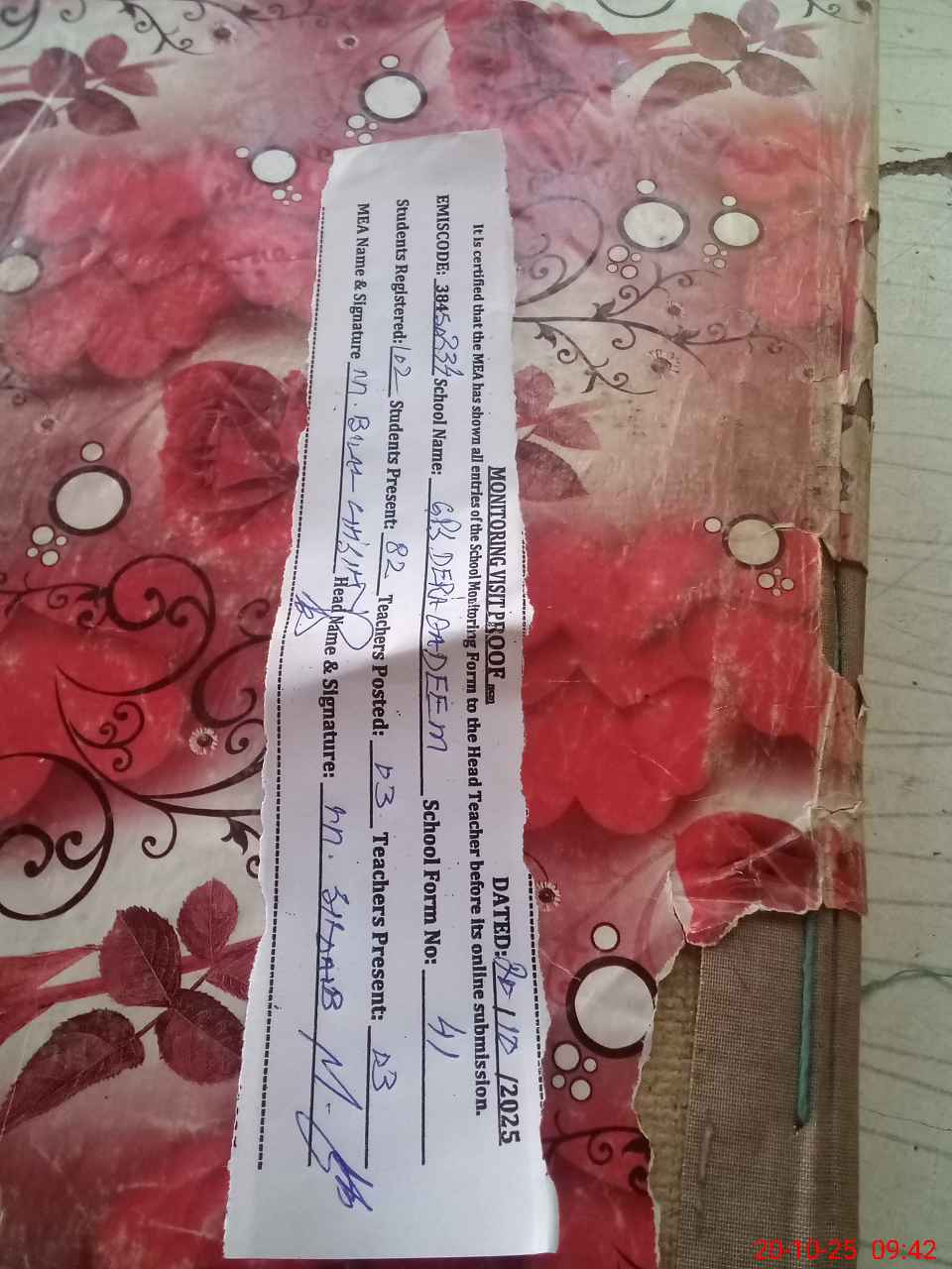 | Attendance Register | Head Teacher | MEA with School | Visit Proof |